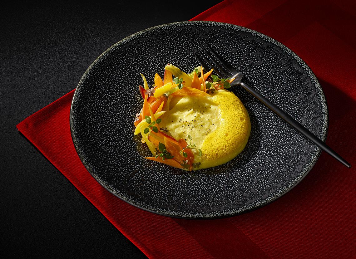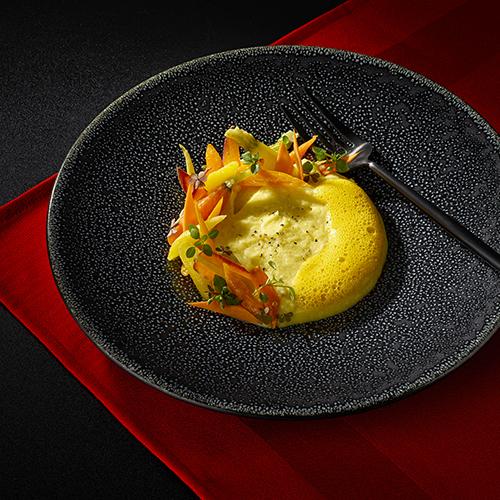 Dressez joliment tous les éléments dans une assiette et décorez de quelques copeaux de carottes et d’herbes