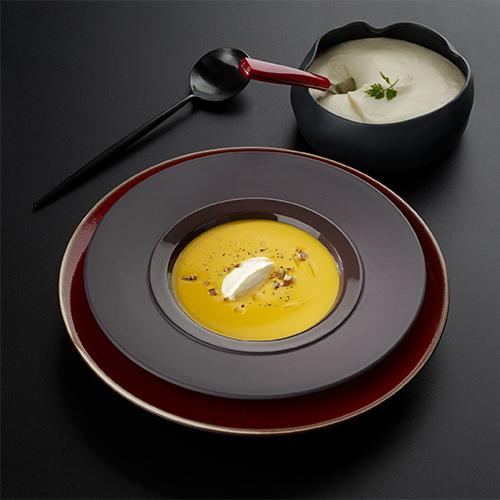 Servez le velouté chaud avec de la crème fraîche dessus, des morceaux de noix, du cerfeuil et un filet d’huile de noix
